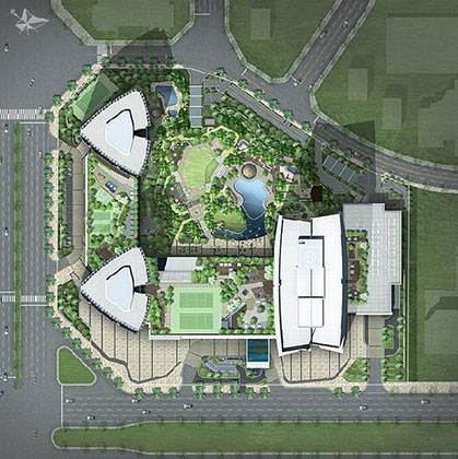 Dự án nổi bật tại phía Tây với chiều cao vượt trội 72 tầng cho tòa tháp chính trung tâm và 2 tòa tháp phụ cao 50 tầng ở 2 bên.